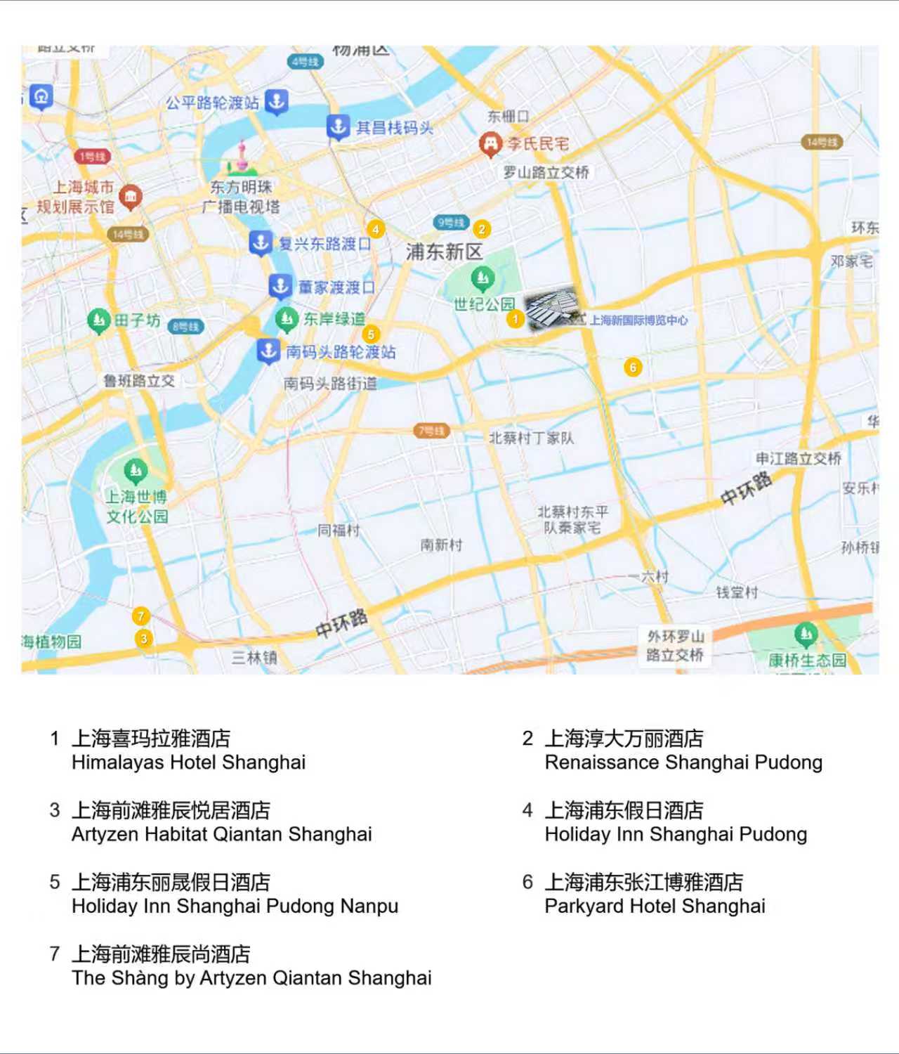 Shanghai New International Expo Centre (SNIEC) is located in Pudong New Area of Shanghai and easily accessible using many means of transport.The public traffic interchange named “Longyang Road Station” for buses, metro lines and maglev, stands around 600 meters apart from SNIEC. It takes about 10 minutes to walk from the “Longyang Road Station” to the fairground. In addition, Metro Line 7 is direct to SNIEC at Hua Mu Road Station whose exit 1 and 2 are close to Hall N1 of SNIEC.